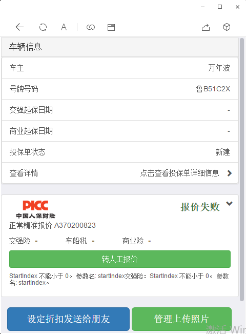 【青岛安达】微信端,人保,个别车,报价提示:“StartIndex 不能小于 0”。