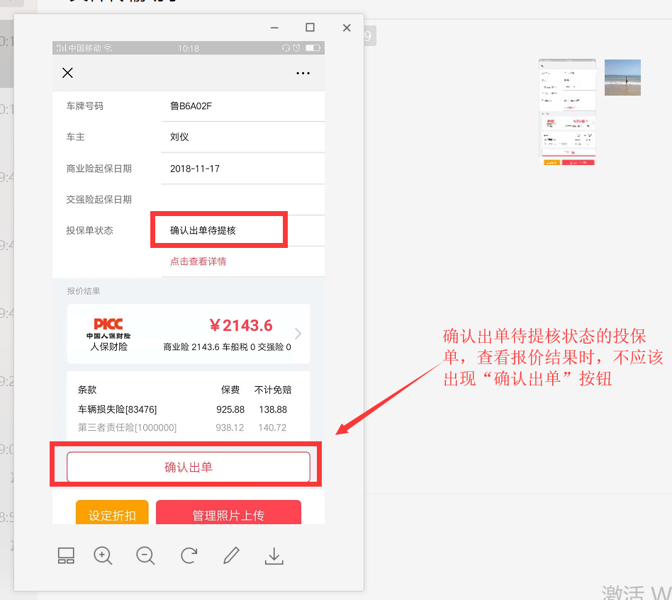 历史保单查询中查看“确认出单待提核”状态的投保单,点击报价结果进行查看,不应该出现“确认出单”按钮。